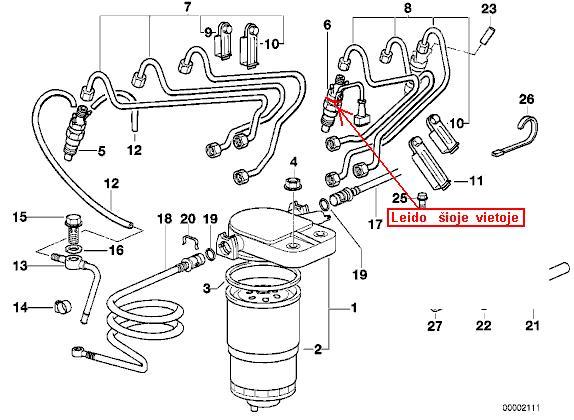 Pradėk nuo purkštuko su laidu (4 nuo priekio), tai lengviausias patikrinimo būdas iš kur tas kvapas.. Šiaip pas mane jis leido, bet keisti nereikėjo. Aš jį išėmiaiu, nuvežiau pas meistrą, patikrino su tokiu aparatu kur slėgio duoda ir nustatė, kad leidžia per sudūrimą. Suveržė jį ir viskas, davė dar naują varinę tarpinę ir grįžtamasias šlangutes naujas, nes mano jau buvo padegusios nuo karščio. O paskui beliko įsisukti, įsukti reikia 30 Nm jėga, čia praverčia dinametrinis raktas.