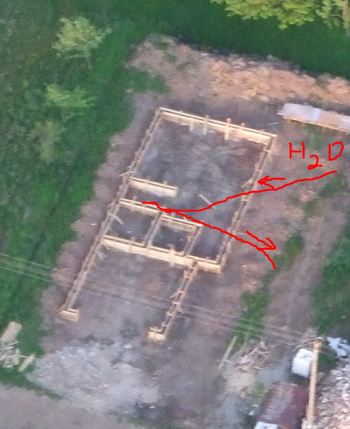 Na ka, pamatai baigti. Labai dziaugiuos kad lyja, nereik vaziuoti ir laistyti pamatu :) Pats vakar nustebau kaip greitai pavyko islieti su tuo siurbliu pamatus, viskas truko gal 40min o gal ir greiciau. Deja aisku buvo ir blogumu, nes skaiciavau kad turetu buti teoriskai 8,5m3 betono, uzmeciau iki 9m3, deja pritrukom 0,5m3. Gerai kad turim masinele tokia, tai po 30min atveze tuos papildomus 0,5m3 betono ir viska graziai uzliejom. Dabar reik tik santechniko pagalbos,t.y. konsultacijos. Gal cia toks butu? :) Zodziu ar taip imanoma padaryti?Pridedu paveiksleli. kazkaip baisu kad po n metu jei vamzdis kanalizacijos ar vandens truktų tai butu jau nekas. o aplink eiti tai irgi nesamone butu manau. Architektas tik ryt brezini duos, bet noriu pasikonsultuoti ir su jumis nes antradieni jau zadu kasti. o i savaites gala jau uzpils viska zvyru. Deja pakeisti valymo irenginiu ir grezinio vietos negaliu.