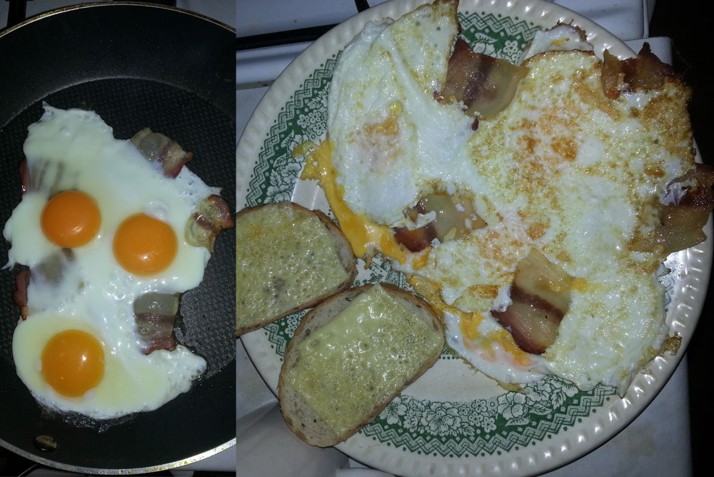 Ištobulintas rytinis maistas. 7 grūdų duona + fermentinis sūris + kiaušiniai + plonai pjauti lašinukai + 1 meistriškas judesiukas ranka (tegyvuoja nelimpanti danga :-)) + kavos puodelis. Jau jaučiu kaip diena šviesėja :-D