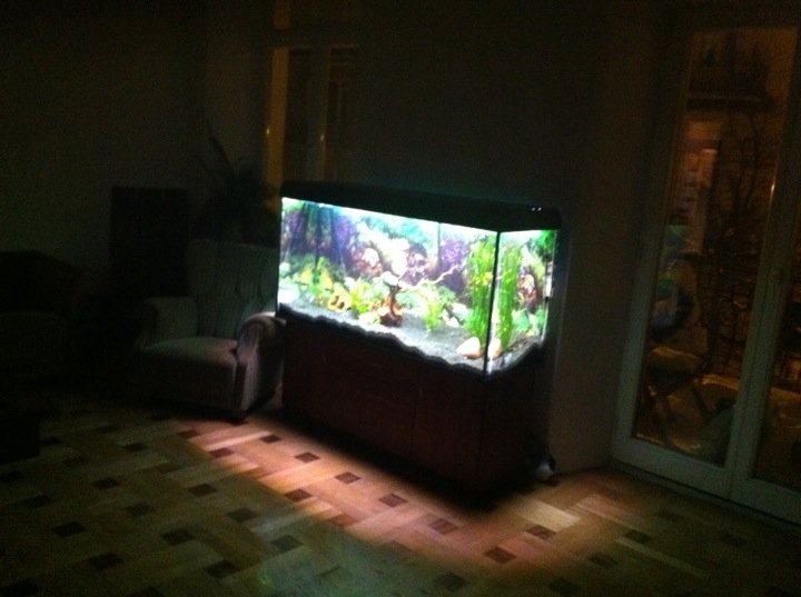 pradzioj butu pats tas 126l akvariumas, maziau terliones su didesniu. Apie 200lt kainuoja + staliukas ir butinai turi buti su pertvara ir stipriu virsum kitaip gali buti pilvas ko pasakoja truks dugnas