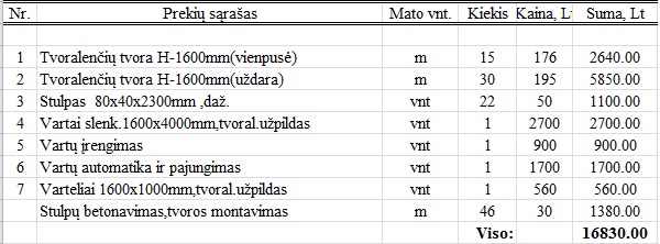 Va, radau tvoros pasiūlymą. Tiesa čia skardinė žaliuzinė tvora, brangi. Bet visa kita turi kainuot panašiai. Tiesa, pasiūlymas 50m. tvorai su vartais.