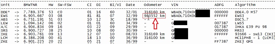 INPA ir DIS parodo tik variklio moto valandas ir skydelio kilometrus, su BMW Scanner pamatysi, jei ne specai keite (kad ir nemokama demo versija, kuria galima paleisti su tavo turimu laidu),