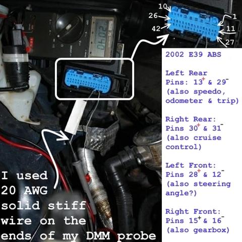 Dar toks pastebėjimas: galima bandyti matuoti ABS daviklį, kaip parodyta paveiksliuke (tik nekiškit storo laido, aš naudojau siuvimo adatėles), su testeriu ant diodo pozicijos (tik ant diodo, nes varžos ten nesimatuoja). Priklausomai nuo poliškumo atsiranda skaitinės vertės. Ką jos reiškia ir kas ten matuojasi neaišku :) bet jei visi 4 ABS davikliai rodo tą patį, tai gal gerai. (keista, bet pigus kiniškas testeris nieko neparodo). Matavau ABS daviklius mėlynais galais.