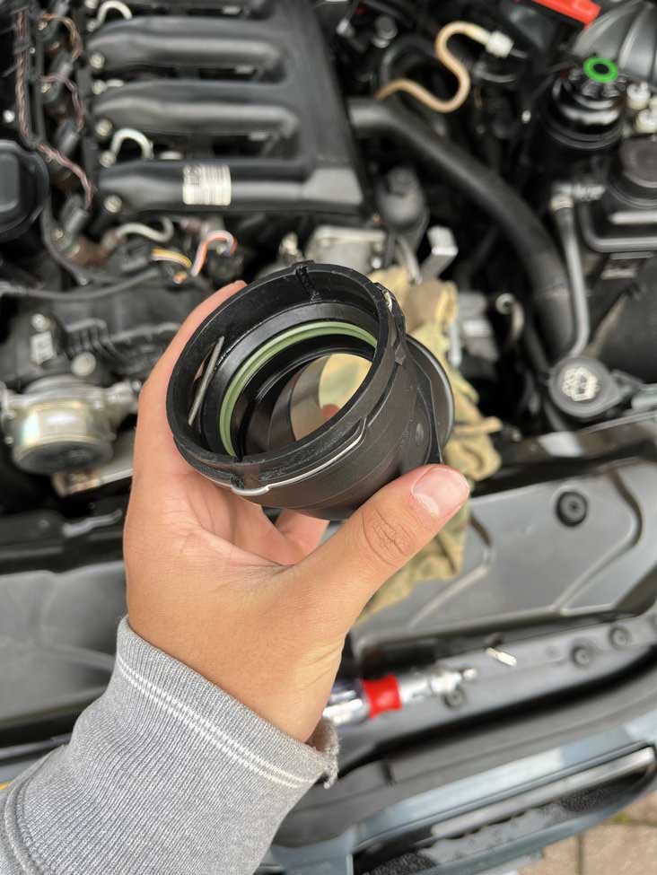Sveiki, pastebėjau jog ties raudonai pažymėta vieta privarva tepaliuko, nuvalau ir po kokiu 100-200km vel randu balute. Nuėmus viršutinės intercoolerio žarnos plastmasinę tą galva, matosi EGR vožtuve tepaliuko ir matomai prasisunkia tepalas pro tą interkulerio zarnos galva kuri uzsimauna ant voztuvo.