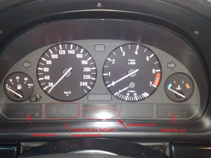 Sveiki, nezinau kur imesti savo problemele, bet jei kas tai atsiprasau, ziurejau paieskoje tai neradau panasios problemos. Problema su spidometru BMW E39 525d 2001m. Reiskia apacioje yra BC kur isvedama info apie vid kuro sanaudos, temperatura, kiek gali pravazioti su esamu kuru bake ir t.t, bet informacija isvedama, bet apsvetimo nera. Gal cia reiketu isimti spidika ir pasiziureti lemputes, nes lempuciu zinau ira 5vnt gal kokia perdege, seip viskas dirba viskas sveciasi tik apatine juostele nesisvecia...prikabinsiu paveiksleli