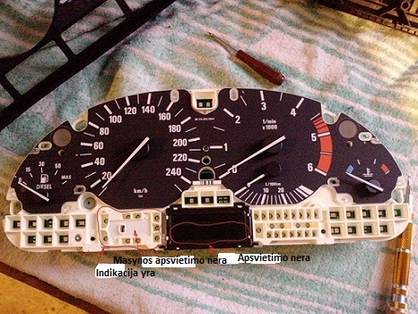 As vel pas jus su savo spedometro skideliu...Razrinkau praktiskai viska, bet nera tu lempuciu paprastu kad jos pakeisti, visur sviesos diodai...Pridedu foto, ir dar karta pazymesiu kas nesisviecia... Kol kas nenuimenejiau rodykliu... Bet as jau abejoju kad ten rasiu tos lemputes...turbut reikes kreiptis pas elektrika...Gal yra kazkam taip buve...? Ir dar, tas apsvietimas dingo vienodu laiku...gal kontaktas koks?