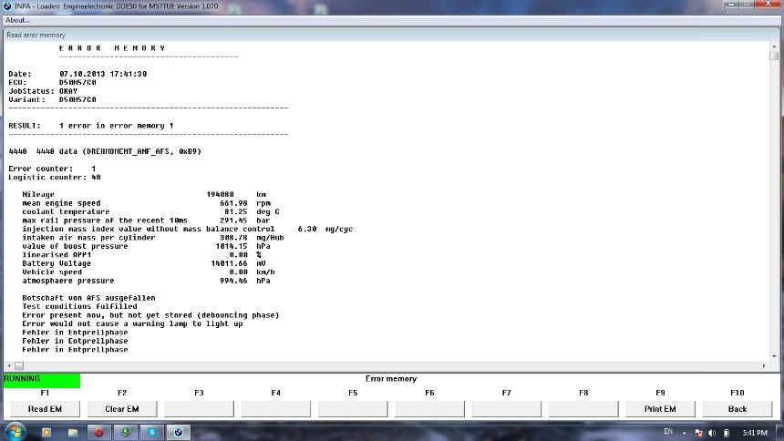 automobilis e60 3l dyzelis, 160kw. Meta tokia klaida, kurios screenshotas pridetas. Manau del jos, paspaudus Status ir bandant ziureti gyvus automobilio parametrus po 5-10s visi rodikliai sukyla iki maximumo ir viska rodo su sauktukais. Nieko negali pasiziureti kaip veikia, nei kaip turbina, nei oro srauto matuokle, nei rpm ir pan. Gal kas zinote ka ta klaida gali reiksti?