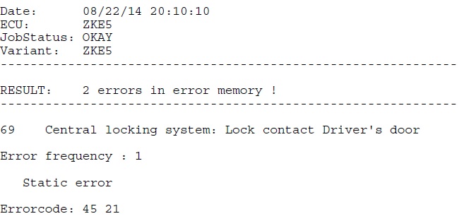 Pirma klaida reikštų, kad kažkur laidas palūžęs, teisingai? (bet neveikia tik užrakinimas pulteliu, atrakinimas ir bagažinė veikia. Tiesa, kartais suveikia ir užrakinimas, 1 iš 100 kartų)